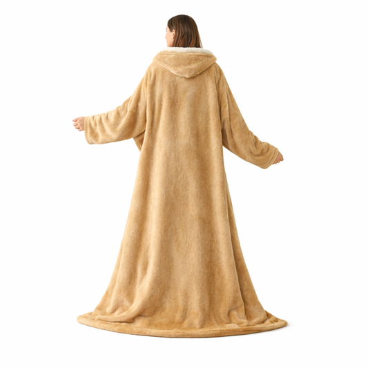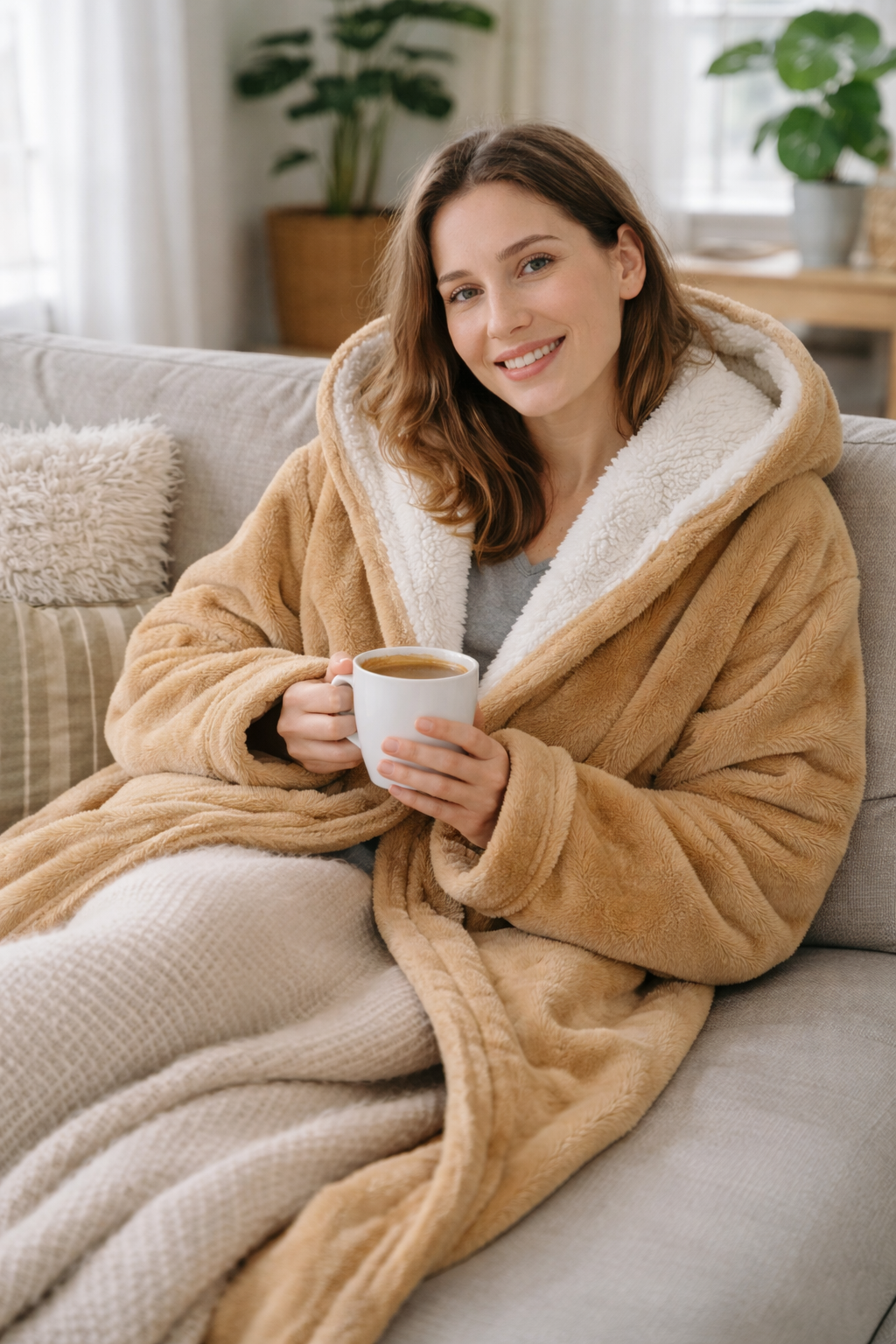 It is designed for complete, full-body warmth! Unlike standard throws, this Kozyus blanket features an extra-deep 18-inch fleece-lined foot pocket specifically engineered to eliminate cold drafts. With its generous 50" x 70" size and long sleeves, you stay toasty from your shoulders all the way down to your toes.